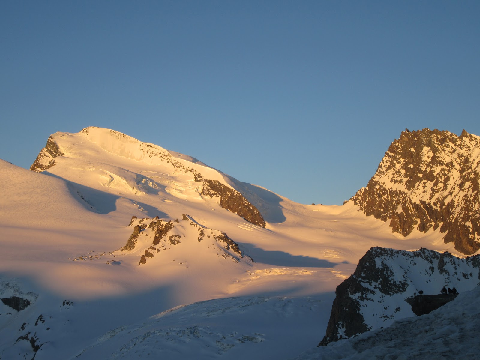 On croise les pauvres cordées qui ont du partir à 5h de Brittaniahütte (chez les fabricants de montre, on rigole pas avec l'heure) et qui montent en plein four avant de descendre dans une neige qui sera trop molle (comme les ponts de neige...).